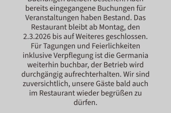 Im Restaurant Germania verwöhnen wir unsere Gäste mit Gerichten der regionalen Küche und achten auf Nachhaltigkeit im Einkauf. Unser Restaurantteam bietet ihnen einen hervorragenden Service und rundet so einen genussvollen Besuch ab.