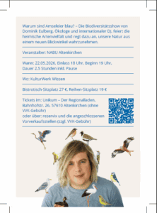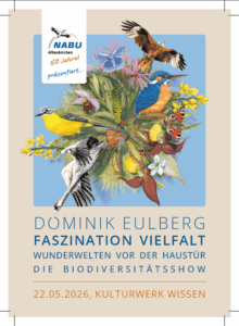Die Liveshow von Dominik Eulberg, Ökologe und internationaler DJ, aufgewachsen im Westerwald, verhilft mit sensationellen Naturaufnahmen und naturbasierter Minimalmusik zu einem Erlebnis der besonderen Art. Es gelingt ihm, komplexe wissenschaftliche Fakten verständlich und humorvoll zu vermitteln. Die Biodiversitätsshow feiert die heimische Artenvielfalt und regt dazu an, die Natur aus einem neuen Blickwinkel wahrzunehmen.