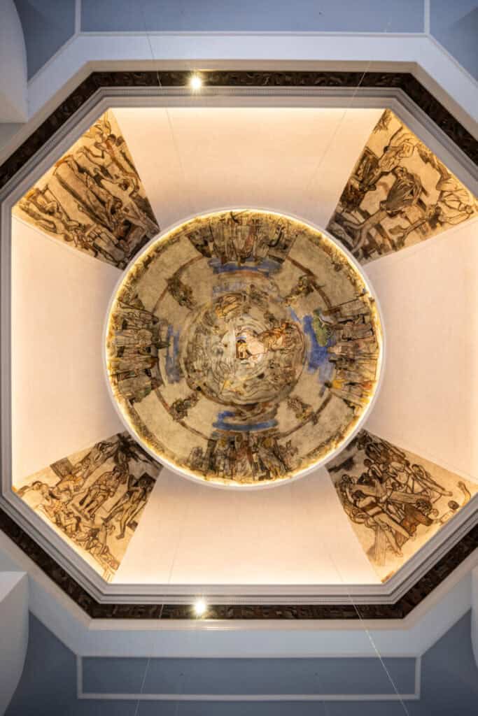 Anschließend geht es ins Innere der Kirche, die nach einem schweren Brand im Jahr 2023 aufwendig restauriert wurde. Die Deckenfresken des Kirchenmalers Peter Hecker sind ein besonderer Höhepunkt.