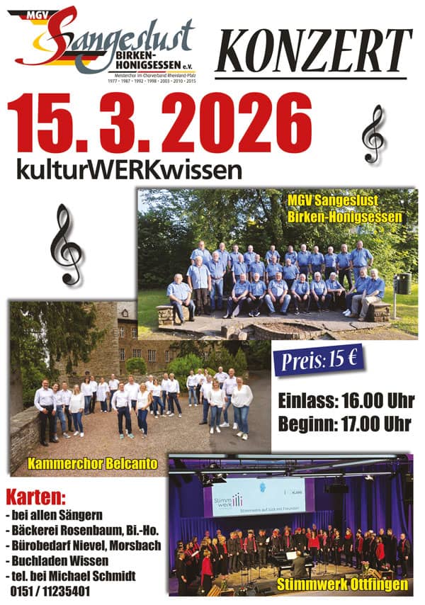 Der MGV Sangeslust Birken-Honigsessen e.V. lädt zu einem besonderen musikalischen Abend ein. Gleich drei herausragende Chöre der Region präsentieren sich auf einer Bühne: