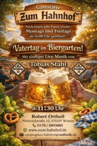 mit zünftiger Live-Musik von Tobias Stahl! Herzlich Willkommen! Veranstalter: Gaststätte Zum Hahnhof, Inh. Robert Ortheil